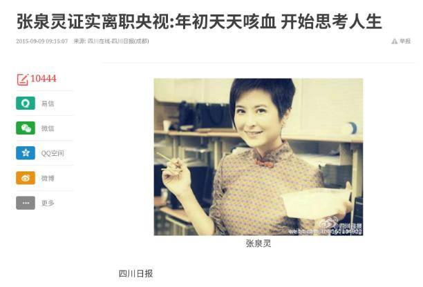 2015-09-09四川在线-四川日报(成都)关于张泉灵证实离职央视:年初天天咳血开始思考人生的报道