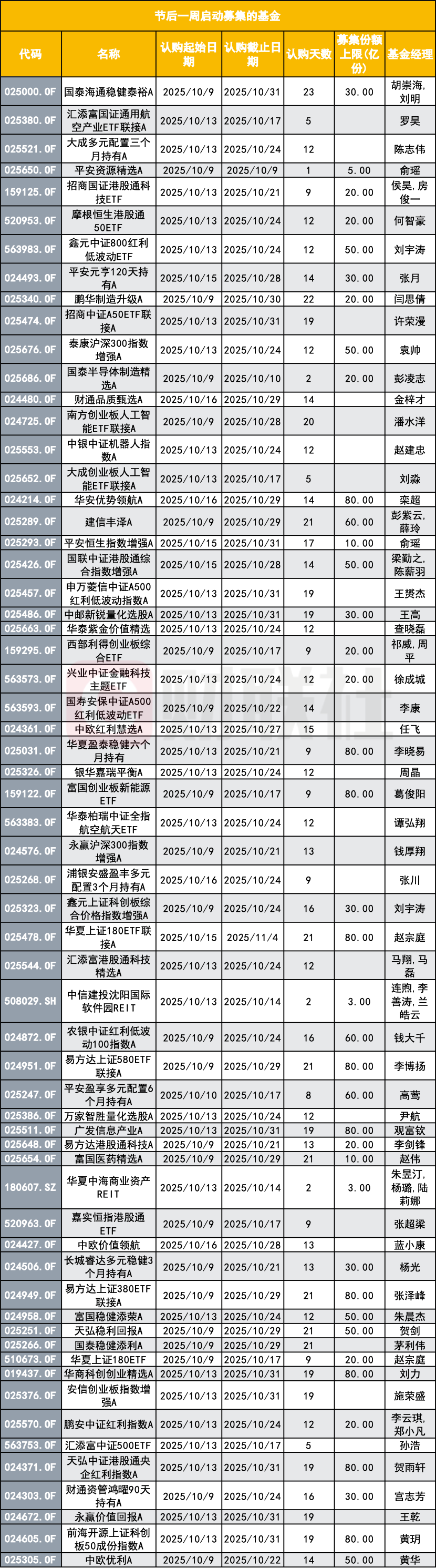 从时间节点来看,十一假期成为今年基金发行的重要分水岭。据Wind数据显示,仅10月9日一个交易日,就有23只新基金开启发行;整个节后一周内(10月9日-16日),已有至少62只产品定档,展现出市场对年末行情的乐观预期。而在这批产品中,知名基金经理的挂帅无疑成为最大亮点。