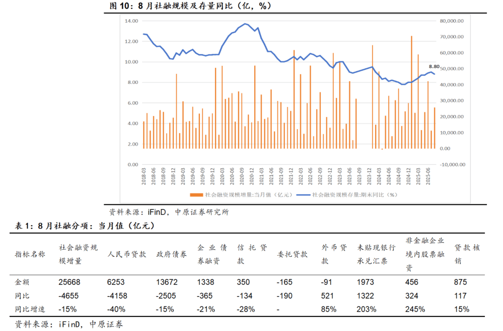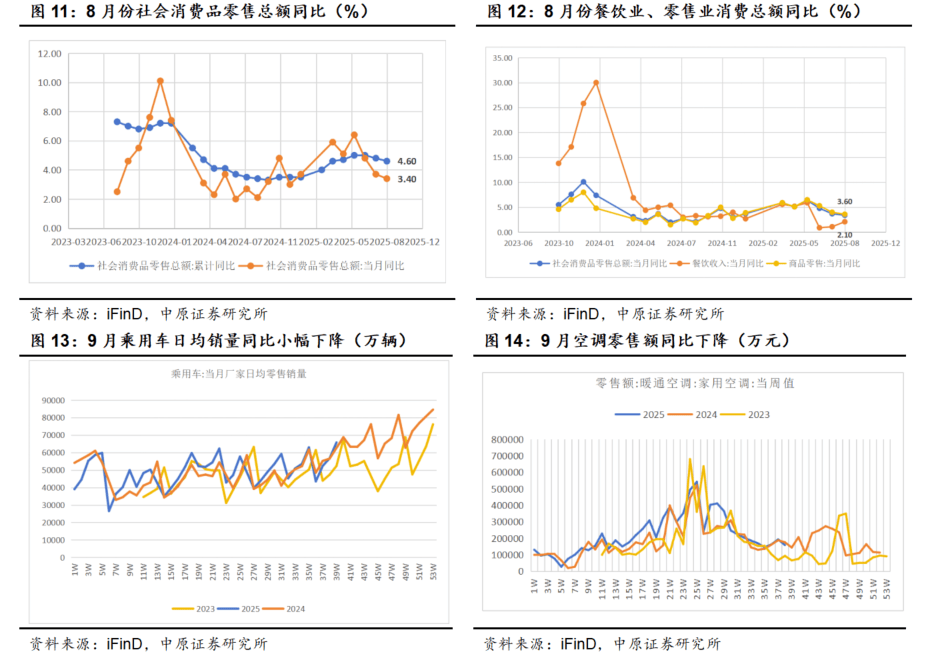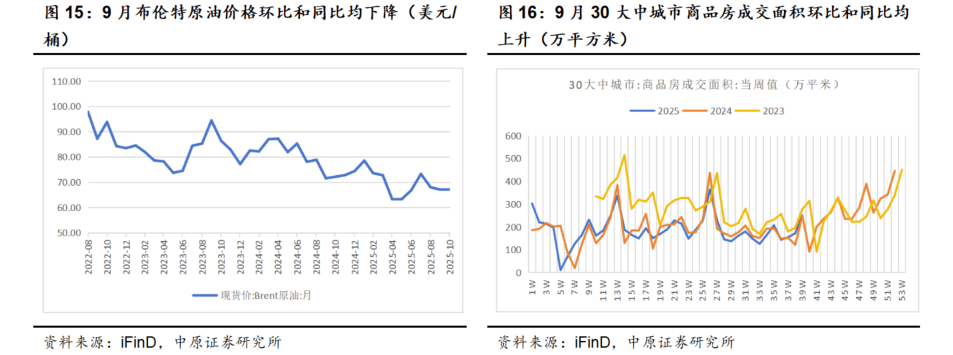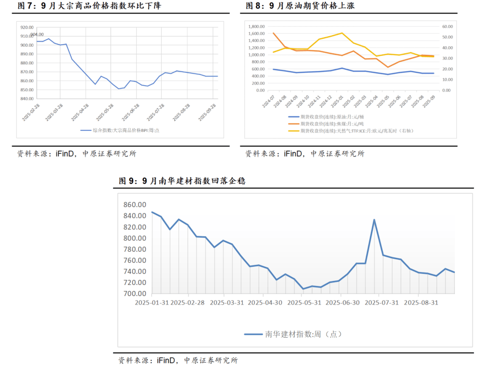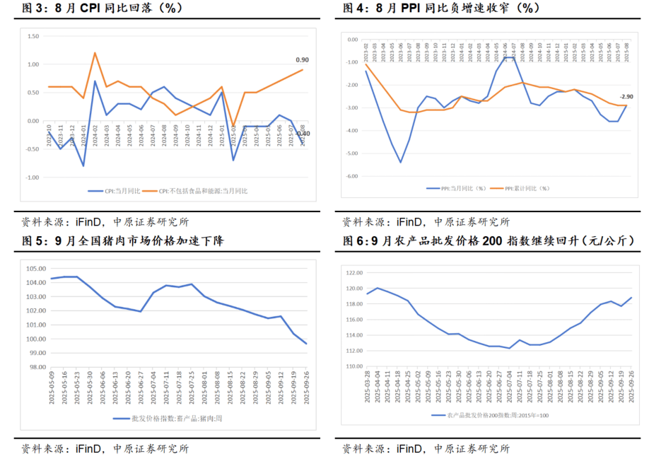 8月份CPI同比回落,PPI同比负增速收窄。8月份CPI同比下降0.4%,核心CPI同比上涨0.9%,已连续4个月上涨。PPI当月同比-2.9%(上期为-3.6%),累计同比-2.9%,说明7月份反内卷政策的逐步实施有所成效,价格跌势得到控制。9月份猪肉价格同比下降16%,环比下降2.1%;农产品批发价格200指数同比下降11.4%,环比上涨0.7%;南华建材指数同比下降14.7%,环比上涨0.3%;9月份原油期货价格较上个月增长。综合9月份高频数据看,预计9月CPI当月同比持平和PPI当月同比有所回落。