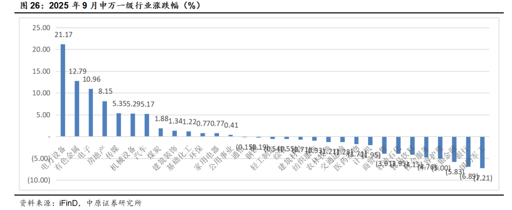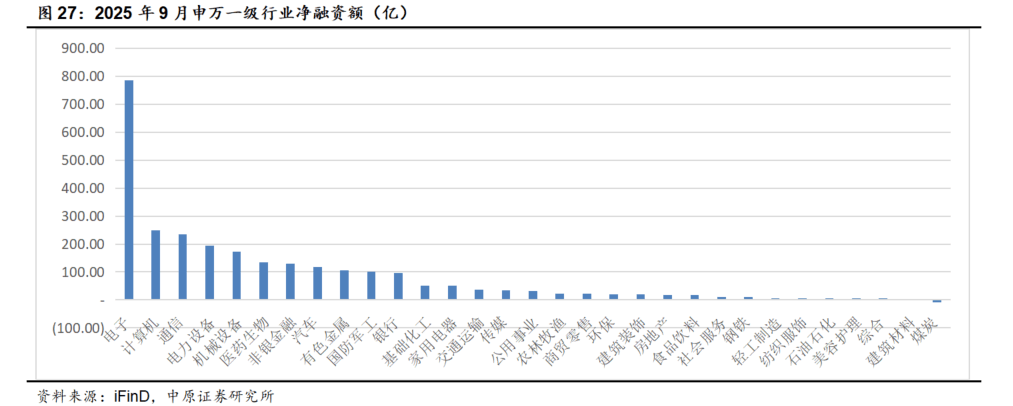 9月涨跌幅表现前五名的行业分别为电力设备(21.17%)、有色金属(12.79%)、电子(10.96%)、房地产(8.15%、传媒(5.35%)。涨跌幅表现后五名的行业分别为社会服务(-4.76%)、美容护理(-5%)、非银金融(-5.83%)、银行(-6.89%、国防军工(-7.21%)。净融资额方面,排名前五的行业为电子(784.24亿)、计算机(248.12亿)、通信(235.51亿)、电力设备(194.87亿)、机械设备(172.64亿)。