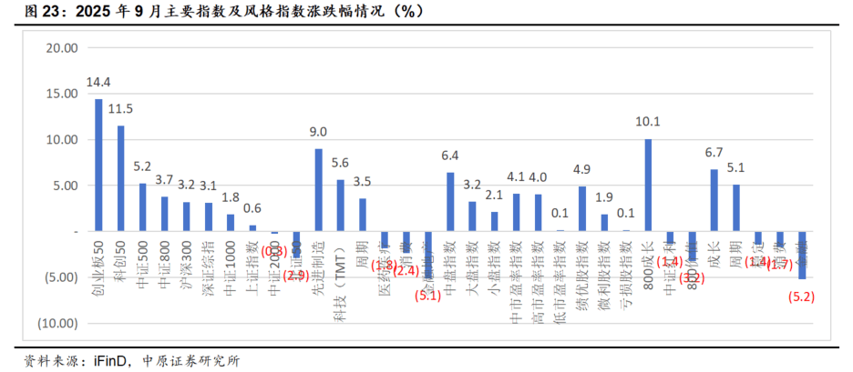 9月权益市场依旧是成长占优。申万风格指数涨跌幅分别为先进制造(8.99%)、科技(TMT)(5.6%)、周期(3.54%)、医药医疗(-1.82%)、消费(-2.4%)、金融地产(-5.12%)。中信风格指数涨跌幅分别为成长(6.72%)、周期(5.11%)、稳定(-1.42%)、消费(-1.71%)、金融(-5.21%)。