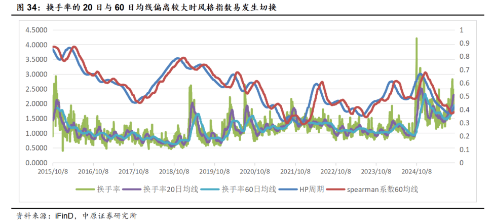 Spearman相关系数所计算的市场拥挤度,本质上是从价格维度进行描述的(即相关系数是基于行业日涨跌幅计算得出)。而我们在用均线来描述Spearman系数指标时,与HP滤波划分的周期(最优解)之间存在明显的滞后性。这种滞后性使得预判指标的拐点变得极为困难,极大地限制了其在实际市场分析中的应用价值。因此,考虑引入“量”的角度,即换手率指标,来辅助分析风格指示的作用。换手率作为市场活跃度的重要指标,能够从交易活跃度的角度提供额外的信息,从而帮助更全面地评估市场风格的转变。