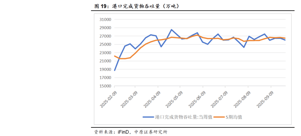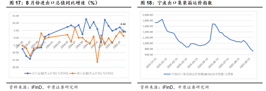 8月份出口总值同比增速下降。8月份出口金额为3218.10亿美元,同比增长4.4%,较7月份下降2.7个百分点。8月宁波出口集装箱运价综合指数较7月下降,从8月底的1098.17点下降至9月底的717.36点。9月底港口完成货物吞吐量5周均值为26,457.82万吨,滚动四周环比下降2.3%。
