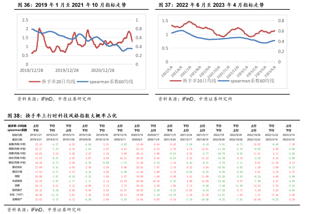为进一步验证指标的有效性,分别统计2019年1月至2021年10月以及2022年6月至2023年4月这两个行情变化较快的阶段,分析综合Spearman系数和换手率指标对风格切换的指示作用效果。
