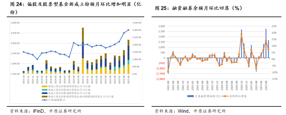 杠杆资金方面,9月份融资市场资金环比回落,当月两融余额环比增长1670亿(上月为2744亿),环比增速为7.4%。新发基金方面,股票型基金发行份额为658.43亿,环比增长186.54亿份;混合型基金发行份额为302.92亿,环比增长159.35亿份;偏股型基金发行份额为971.91亿,环比增长310.45亿份。