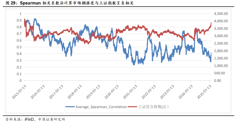 通过对比拥挤度指数与上证综合指数的走势,两者呈现显著的负相关性。当拥挤度指数上升时,上证综合指数往往面临下行压力,表明市场拥挤度的增加可能预示着市场的短期调整。但是拥挤度指标(Average_Spearman_correlation)本身具有较大的短期波动性,准确判断其趋势具有一定的挑战。