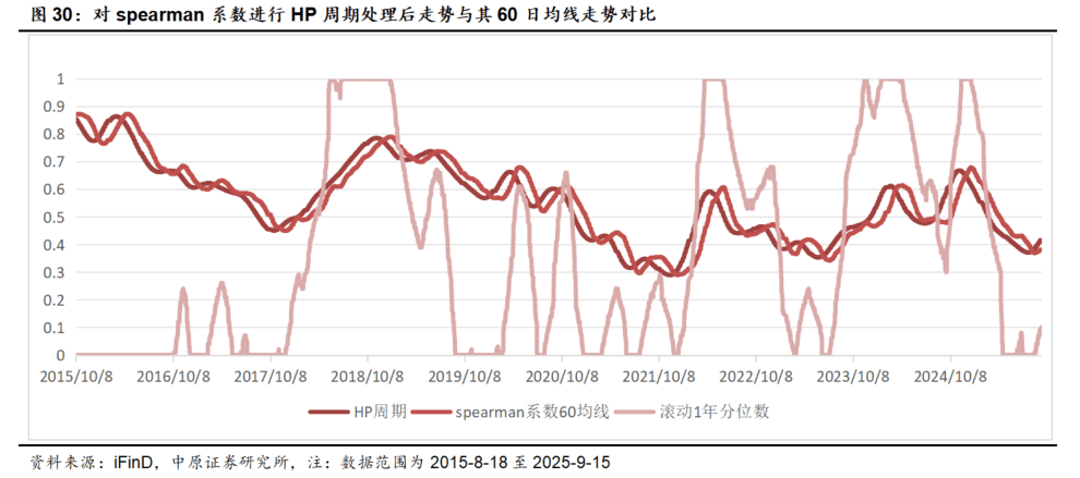 HP滤波(Hodrick-Prescott Filter)是一种广泛应用于金融和宏观经济领域的时间序列分解技术,主要用于从数据中提取长期趋势成分并分离短期波动。其原理是通过最小化一个特定目标函数,在数据拟合度与趋势平滑度之间寻求最佳平衡。下图所示,当我们将Spearman相关性指标经过HP滤波处理后,与60日均线进行对比,可以清晰地看到,经过均线化处理的指标虽然在一定程度上平滑了波动,但相对滞后。