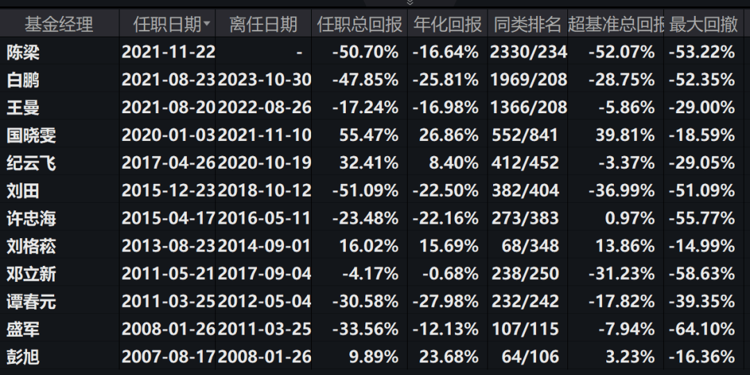 彭旭曾以激进风格在2007年大牛市中声名鹊起;刘格菘后来在广发基金凭借科技股投资跻身顶流;国晓雯在中邮其他产品上也有过不错业绩。但这些明星经理们执掌中邮核心成长期间,均未能扭转乾坤。任职最长的邓立新因“老鼠仓”被调查,期间管理费收取超10亿,却留下长期亏损的窟窿。