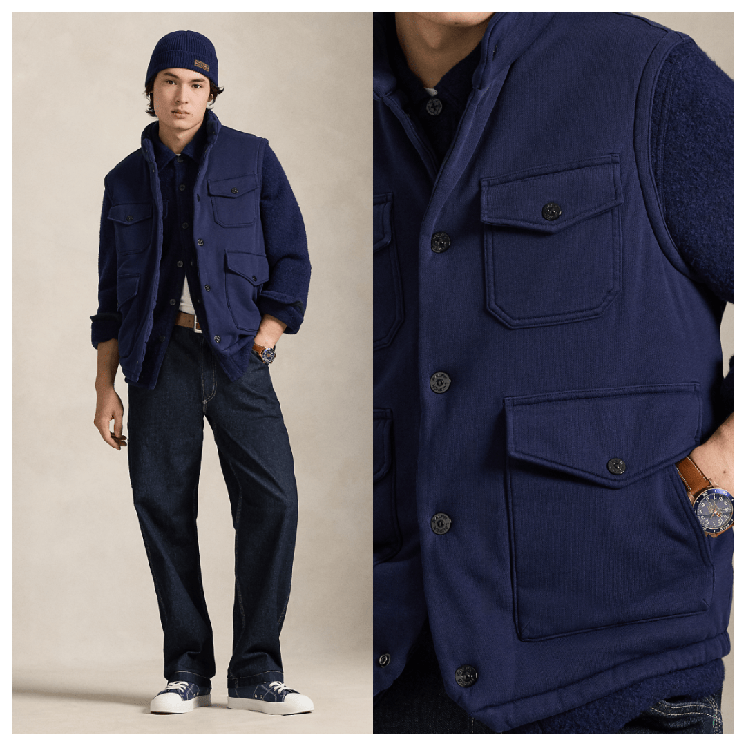 Ralph Lauren的起绒布实用马甲则更有美式风情,大身采用棉质面料,加上四个按扣式大口袋的工装设计,穿起来也蛮酷的。