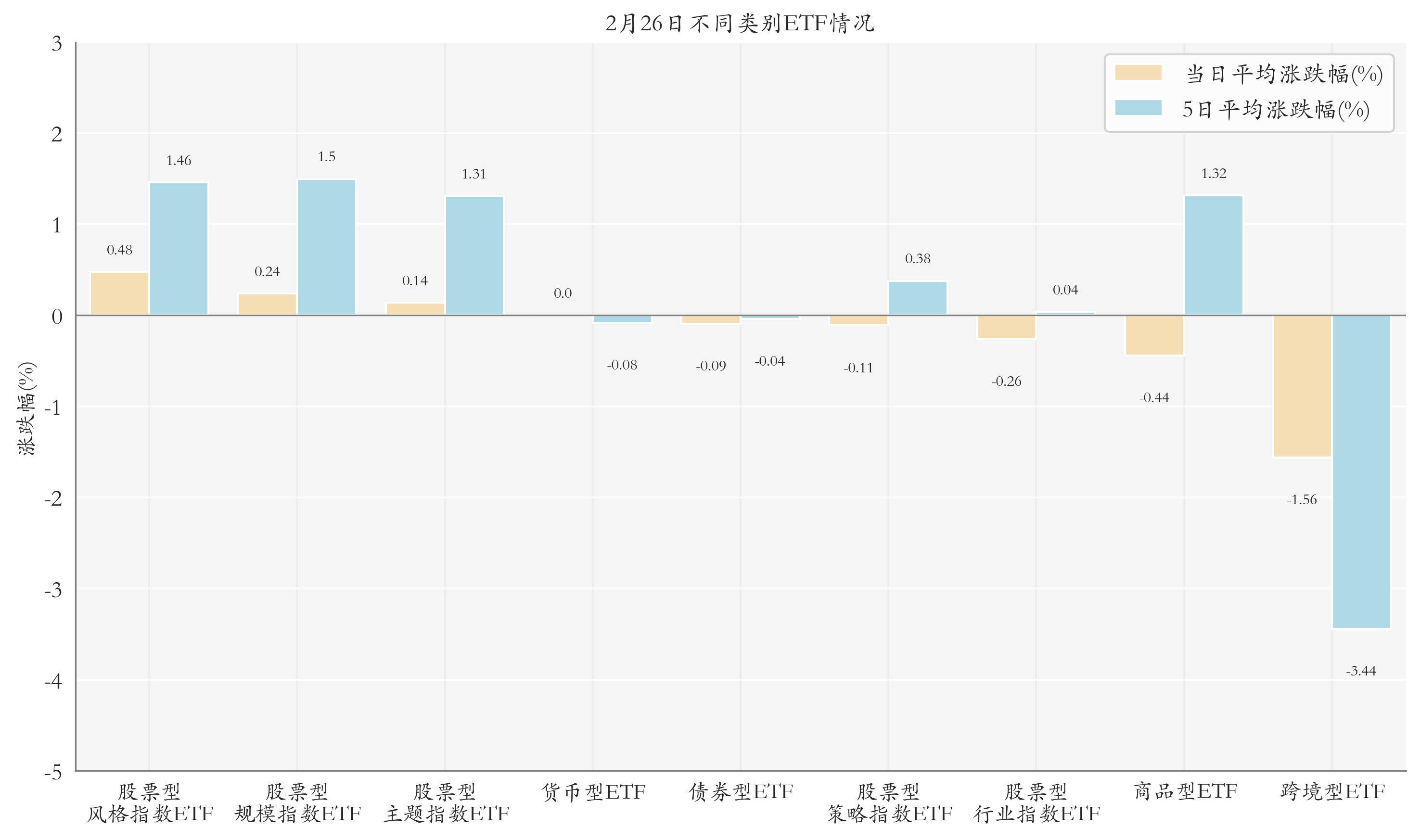 根据ETF基金的规模和涨跌幅计算得出不同分类情况下各类ETF基金的平均涨跌幅。