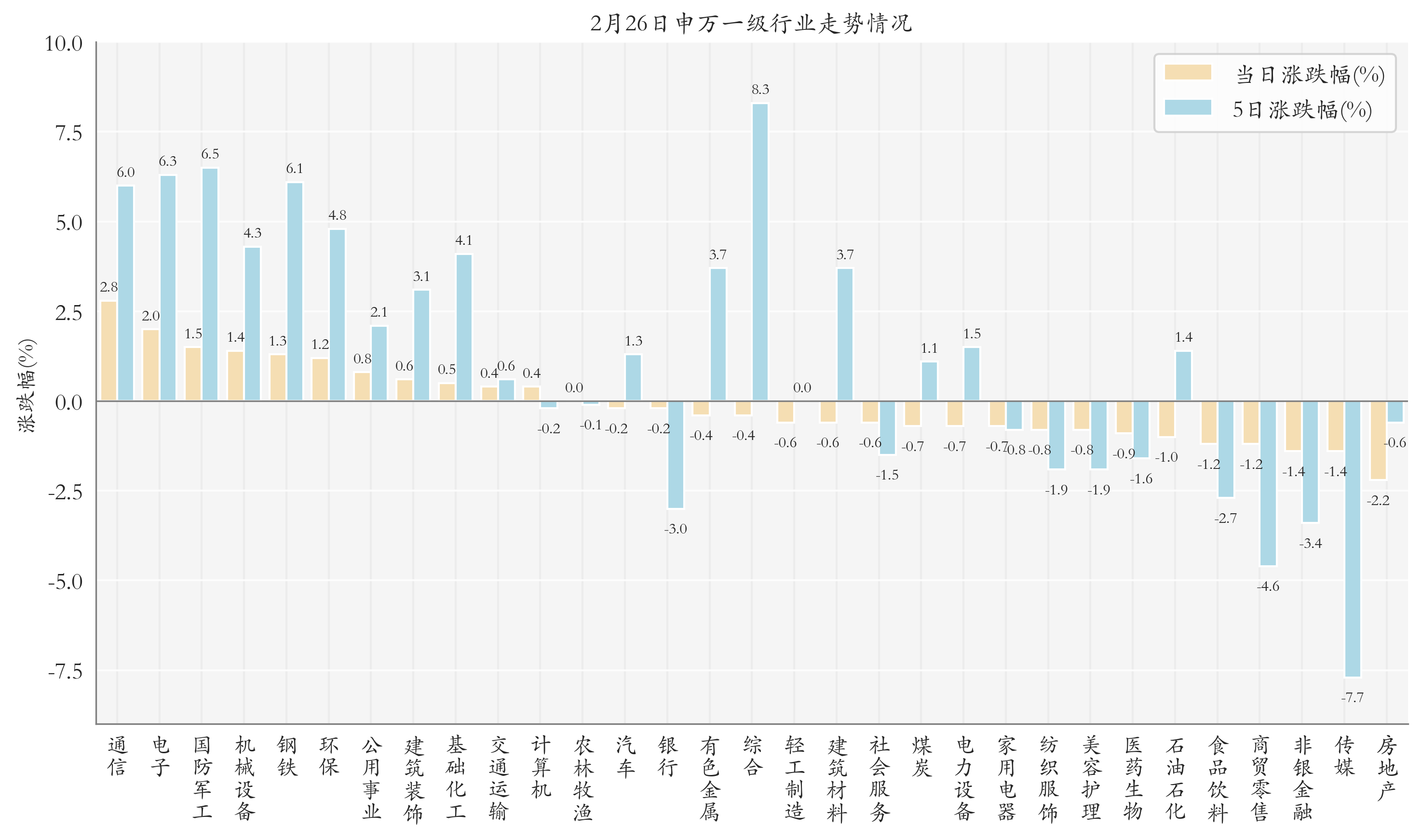 统计今日全部申万一级行业涨跌幅情况,通信、电子与国防军工今日走势排名靠前,日涨跌幅分别为2.84%、1.98%与1.52%,房地产、传媒与非银金融的走势排名靠后,日涨跌幅分别是-2.25%、-1.45%与-1.42%;近5个交易日综合、国防军工与电子的走势排名靠前,近5日涨跌幅分别为8.3%、6.49%与6.32%,传媒、商贸零售与非银金融的走势排名靠后,近5日涨跌幅分别为-7.72%、-4.6%与-3.37%。