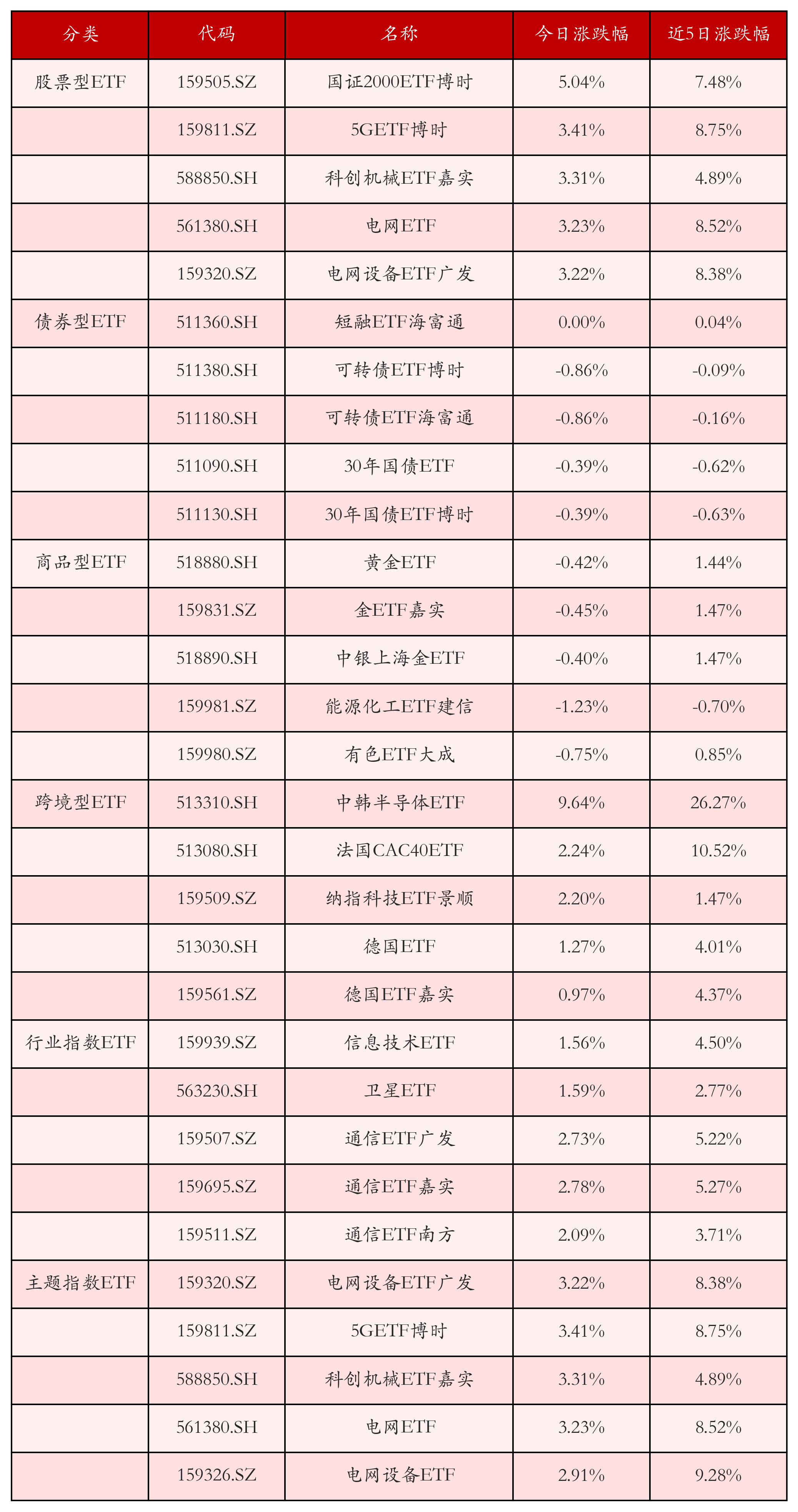 从不同投资种类、行业、主题的ETF产品中找出今日走势行情排名前5的ETF基金,今日涨幅靠前的ETF产品如下表所示。股票型ETF中涨跌幅排名前3位的ETF产品分别为国证2000ETF博时(159505.SZ)、5GETF博时(159811.SZ)和科创机械ETF嘉实(588850.SH),今日收益率分别为5.04%、3.41%和3.31%。