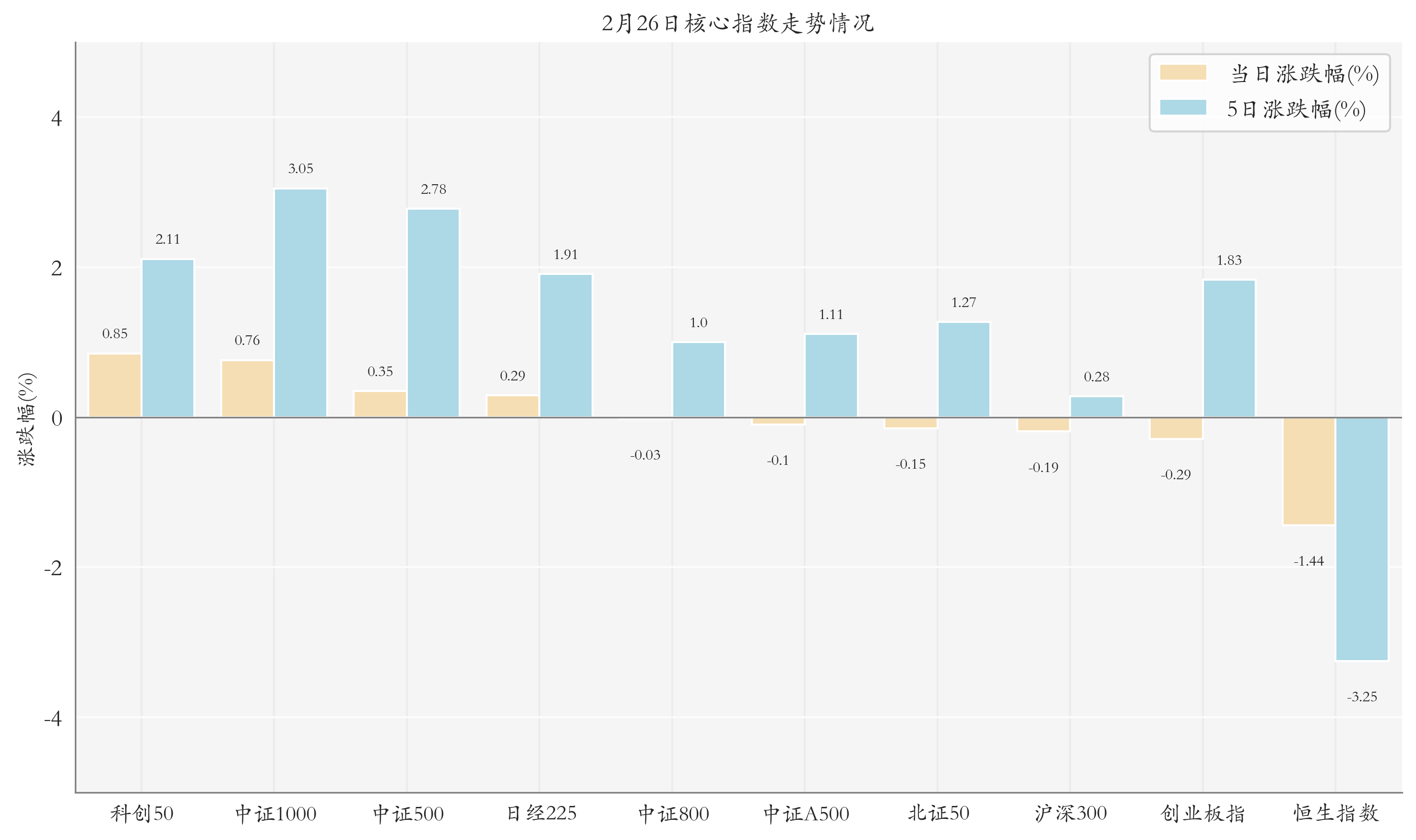 统计A股与海外主要核心指数走势,今日(2月26日,下同)三大指数涨跌不一,其中上证指数下跌0.01%,收于4146.63点,日内最高4152.19点;深证成指上涨0.19%,收于14503.79点,日内最高14536.08点;创业板指下跌0.29%,收于3344.98点,日内最高3351.57点。今日科创50、中证1000与中证500走势排名靠前,日涨跌幅分别为0.85%、0.76%与0.35%;近5个交易日中证1000、中证500与科创50的走势排名靠前,近5日涨跌幅分别为3.05%、2.78%与2.11%。
