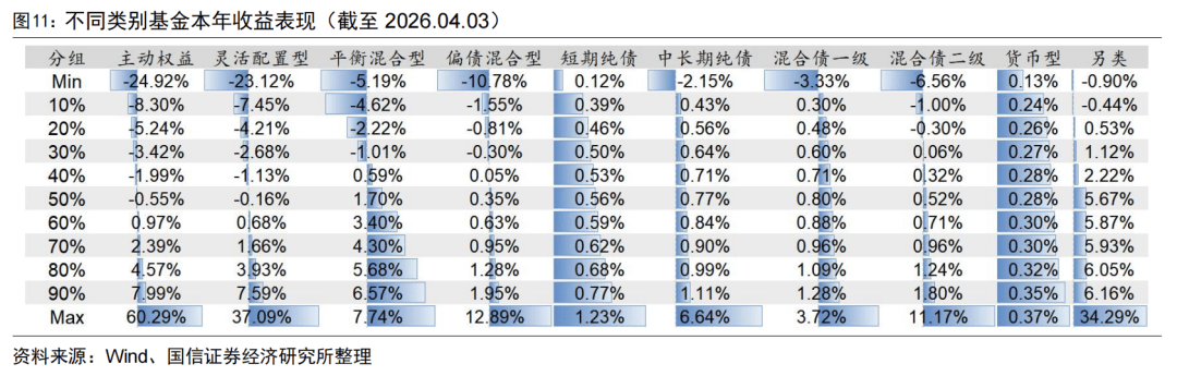上周主动权益、灵活配置型、平衡混合型基金收益分别为-1.03%、-0.87%、-0.56%。今年以来另类基金业绩表现最优,中位数收益为5.67%,主动权益型、灵活配置型和平衡混合型基金的中位数收益分别为-0.55%、-0.16%、1.70%。
