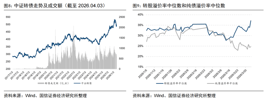 上周中证转债指数下降1.58%,累计成交3194亿元,较前一周减少176亿元。截至上周五,可转债市场转股溢价率中位数为37.20%,较前一周增加3.89%,纯债溢价率中位数为24.73%,较前一周减少0.86%。