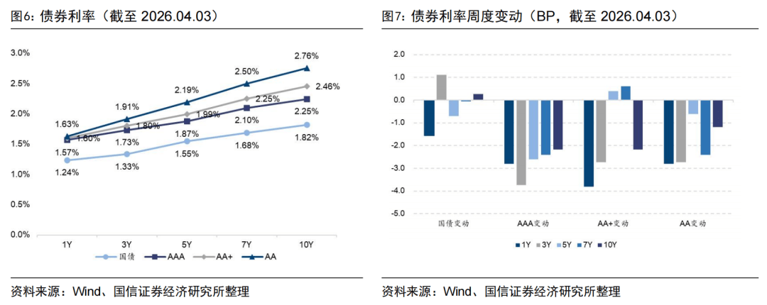 如下图所示,除3年期和10年期外,不同期限的国债利率均有所下行,利差扩大1.83BP。1年期、3年期和10年期不同评级的信用债利率均有所下行。
