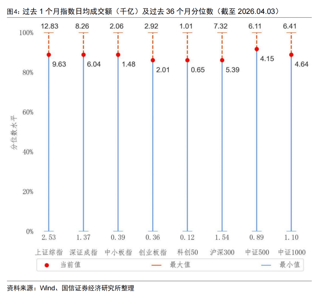 按月度来看,过去一个月主要宽基指数的日均成交额均有所下降,主要宽基指数均位于过去36个月85%-95%的历史分位水平。
