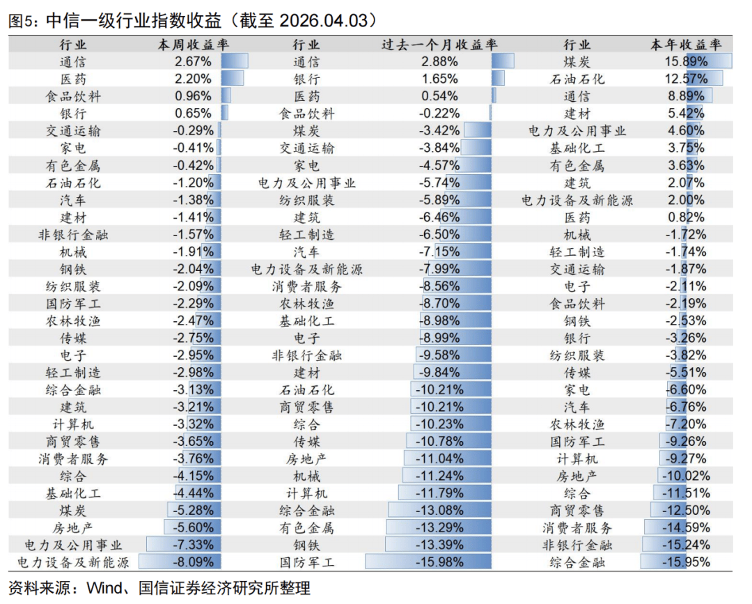 行业方面,上周通信、医药、食品饮料收益靠前,收益分别为2.67%、2.20%、0.96%,房地产、电力及公用事业、电力设备及新能源收益靠后,收益分别为-5.60%、-7.33%、-8.09%。过去一个月,通信行业累计上涨2.88%,收益最高,国防军工行业累计下跌15.98%,收益最低。今年以来,煤炭、石油石化、通信的累计收益较高,分别为15.89%、12.57%、8.89%,相比之下,消费者服务、非银行金融、综合金融等多个行业的收益率最低。