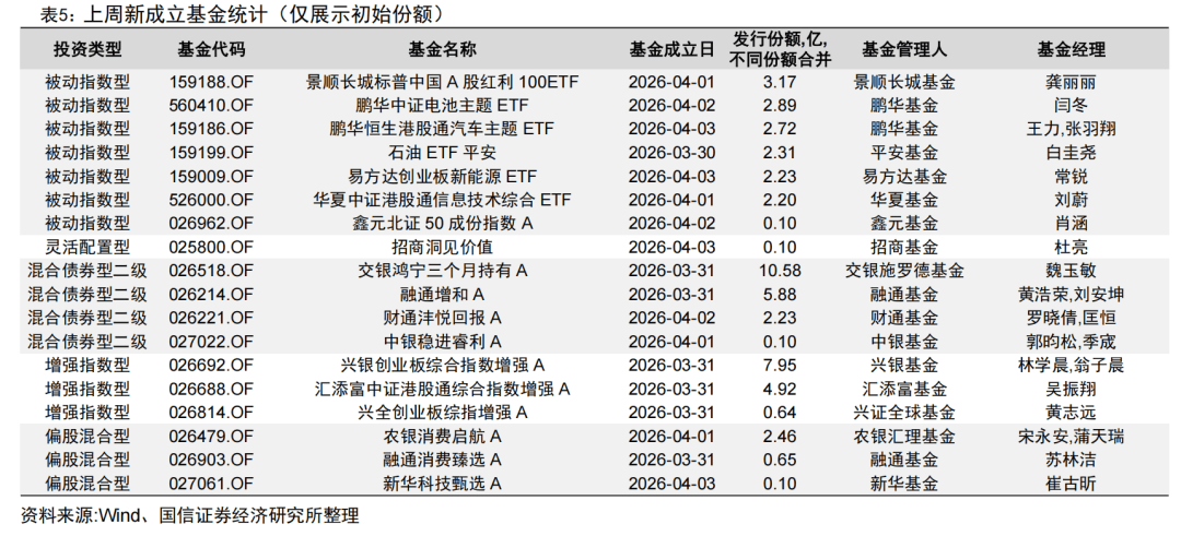上周新成立基金18只,新发基金中数量较多的类型为被动指数型(7只)和混合债券型二级(4只),发行规模分别为15.62亿元和18.79亿元。