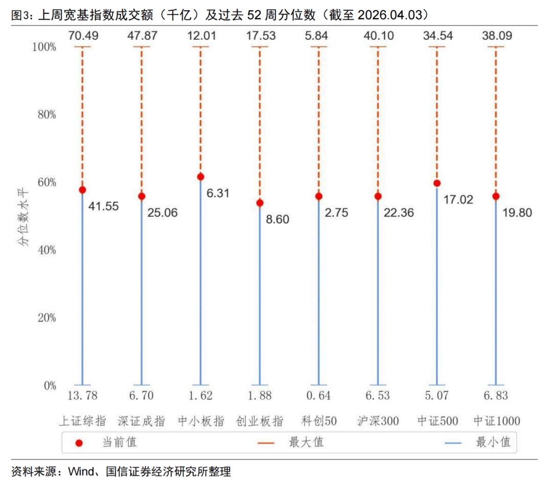 从成交额来看,上周主要宽基指数成交额均有所下降,在过去52周的样本期内,主要宽基指数均位于50%-65%的历史分位水平。