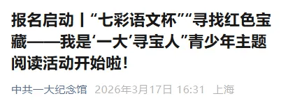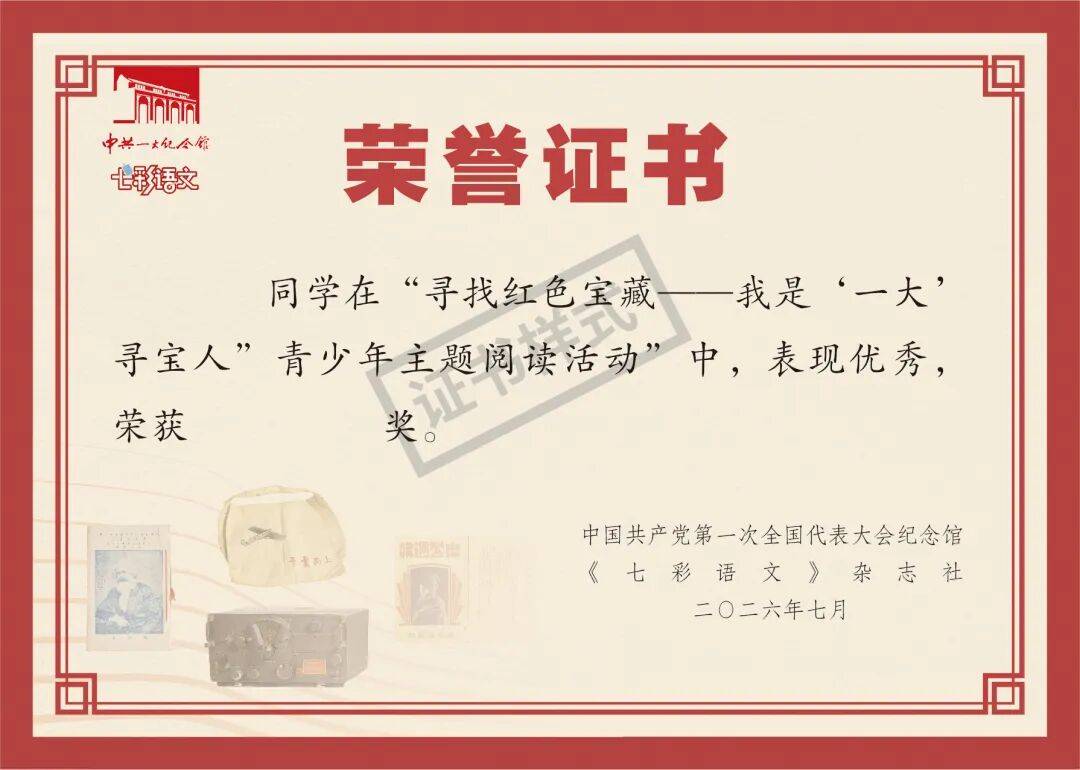 在这样一段充满文化与历史意义的时间里,一场特别的阅读行动也即将开启。一大纪念馆与《七彩语文》联合发起“寻找红色宝藏 ——我是‘一大’寻宝人”青少年主题阅读活动。我们邀请全国中小学生一起走进书本、走近文物,寻找属于自己的“红色宝藏”。