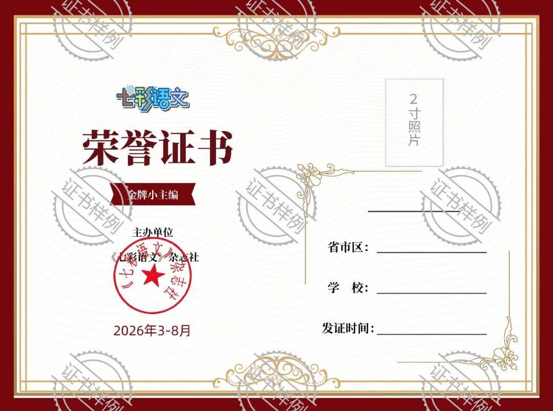 ● 为鼓励同学们展示自我风采,可在小红书发表作品,带话题,@《七彩语文》杂志社 @一大纪念馆,并在正文中附带报名时获取到的活动编码(6位数),工作人员将根据截止日期当天24时的点赞量,评选出网络人气奖。